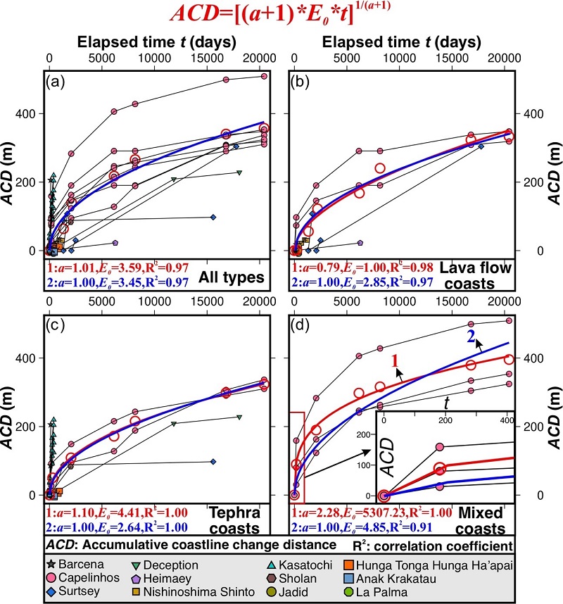 研究团队对1952年至2022年间全球12处火山喷发形成的新生海岛海岸开展系统研究,发现其侵蚀速率普遍呈现“早期快速侵蚀、后期逐渐减缓”的规律性趋势。同时,研究人员利用反幂函数方程成功实现了对该规律的高精度数值拟合,并进一步发现,当依据海岸岩性类型进行分组时,模型拟合精度显著提升。