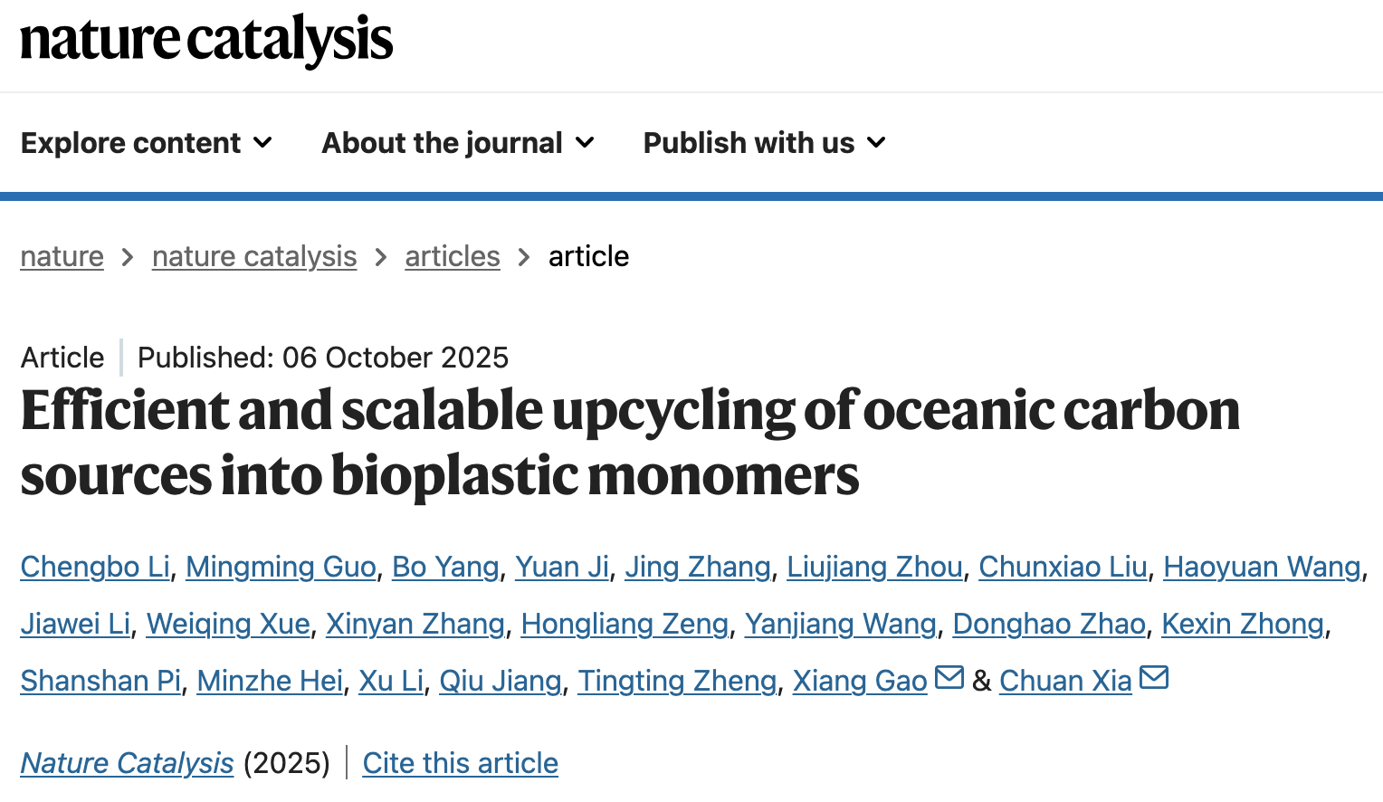 北京时间2025年10月6日,中国科学院深圳先进技术研究院合成生物学研究所高翔课题组与电子科技大学夏川课题组合作,在国际高水平学术期刊Nature Catalysis上发表了题为Efficient and scalable upcycling of oceanic carbon sources into bioplastic monomers的研究成果。团队率先提出并验证人工海洋碳循环系统:面向天然海水场景高效捕集CO2,电催化制备可进入生物制造的平台中间体,再经工程化微生物升级转化为高价值分子与材料。研究以可降解材料单体为示范,凸显“捕碳造物”的平台能力与可扩展性,为我国“蓝色经济”、双碳目标与绿色低碳技术创新提供新路径。
