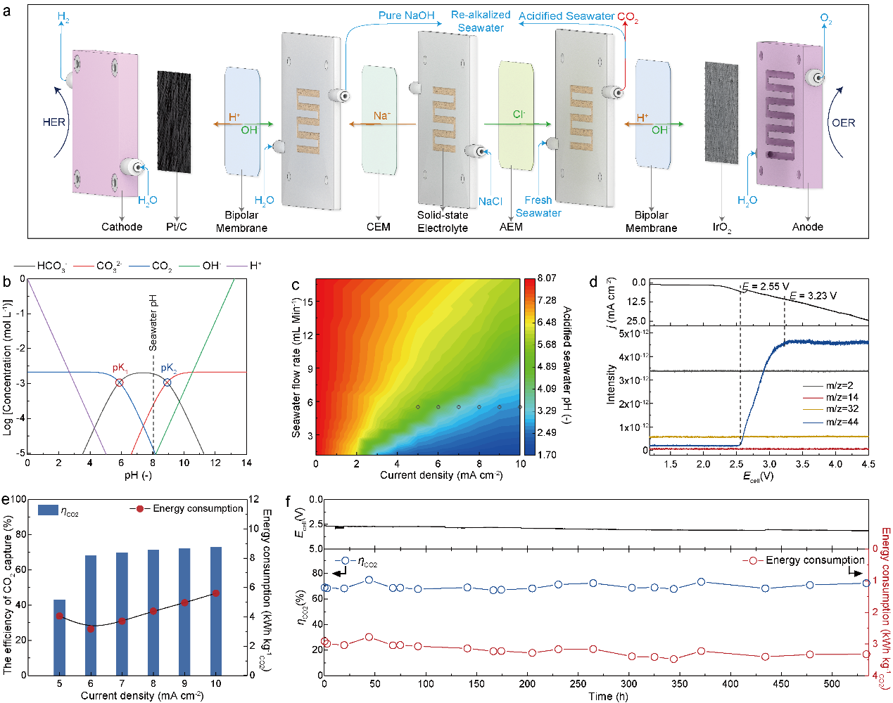 研究团队开发了一种用于海水碳捕集的装置,并在结构设计与运行稳定性方面取得了突破。该装置能够以天然海水为原料实现连续二氧化碳捕集,在实际条件下稳定运行超过500小时,显著提升了系统的可靠性。实验结果显示,该装置的碳捕获效率超过70%,并可同步副产氢气;其捕获每吨二氧化碳的成本仅为229.9美元,展现出潜在的经济竞争力。该成果不仅验证了直接利用天然海水实现持续“捕碳”的可行性,也为将海洋碳汇转化为绿色分子与材料、推动海洋经济发展提供了新的可能性(图2)。