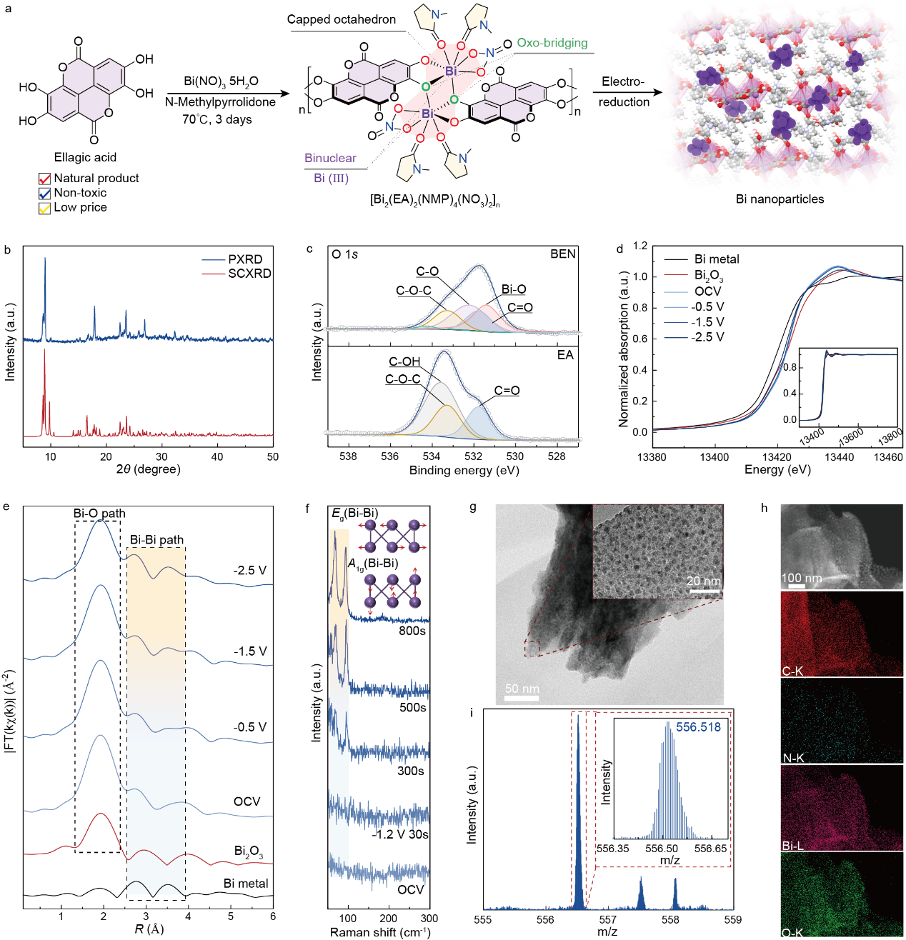 研究团队通过两步法成功合成了Bi-BEN(铋基金属有机框架衍生)催化剂。首先经溶剂热反应制备铋基金属有机框架材料,随后在电化学原位重构过程中形成由有机配体修饰的Bi纳米颗粒。通过单晶衍射、X射线吸收光谱等多种表征手段系统验证了其结构特征,确认了该催化剂材料在实际工况条件下的真实结构(图3)。
