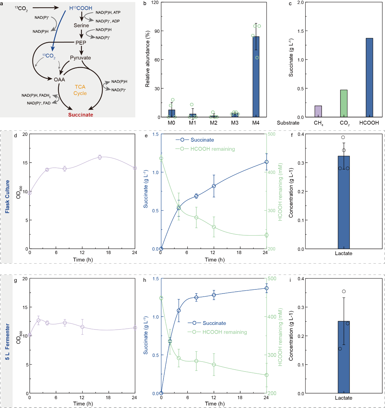 为验证以二氧化碳合成的甲酸作为唯一碳源生产琥珀酸的工业可行性,研究人员系统展示了完整的生产过程:通过碳同位素(13C)标记实验明确证实琥珀酸碳源来自甲酸;在1L与5L发酵罐完成从摇瓶到中试级的放大验证。过程中产生的乳酸产物亦具备材料与化学品价值,提示路线具备并联多产物潜力。结果表明,该系统具备实际放大与产业化可行性,标志着向“边捕碳、边产料”一体化模式迈出关键一步(图6)。