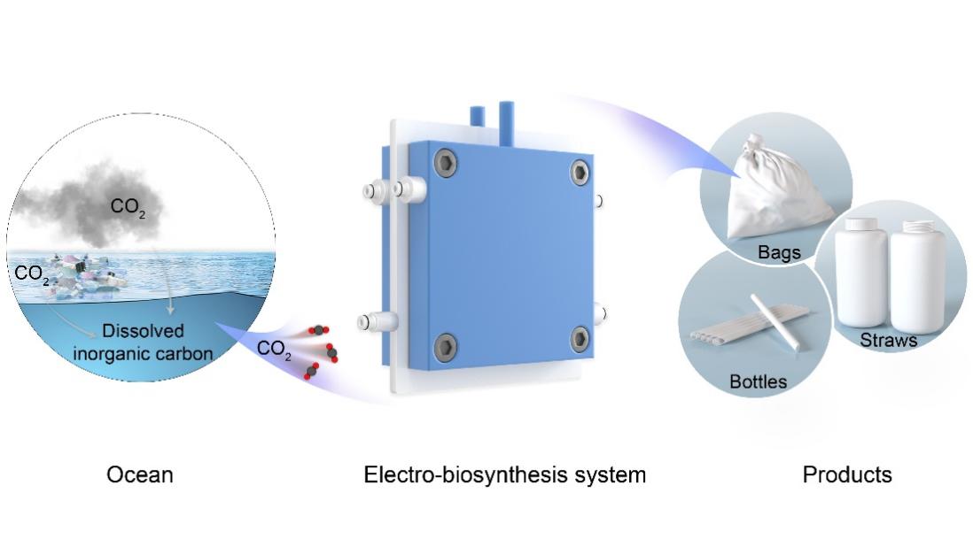 研究团队提出“人工海洋碳循环系统”的总体思路。该系统包括两个关键环节:首先,通过新型的电解装置直接从海水中捕集二氧化碳,有效避免了电极钝化和盐类沉积等问题,实现长期稳定运行;其次,将捕获的二氧化碳通过电化学与生物催化过程,转化为可替代化石工业来源的生物化学品。该路径贯通了从“海水捕碳”到“绿色分子与材料”的全链条,以可降解塑料单体为示范,凸显其在碳循环、资源利用和环境治理中的战略意义(图1)。