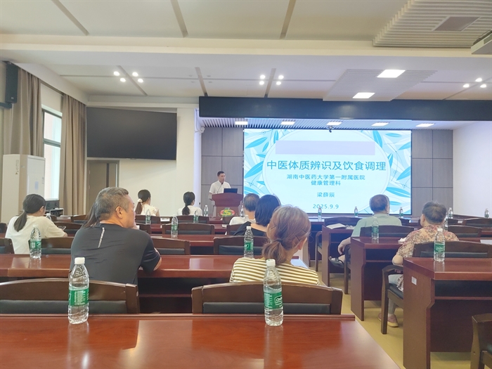 本次活动邀请湖南中医药大学第一附属医院谭朝坚教授专家团队现场授课。主治医师梁薛辰作《中医体质辨识及饮食调理》专题报告,对研究所本年度职工团体体检的整体情况进行总结分析,并系统讲解中医九种体质类型的特征及辨识方法,针对不同体质提出相应的饮食调养、运动保健和生活作息建议,让大家了解自身体质特点,掌握科学养生方法。